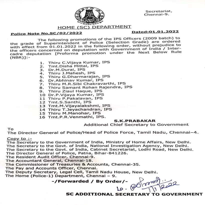 இச்சூழலில் இன்றும் தாம்பரம், ஆவடி மாநகராட்சிகளில் காவல் ஆணையரகம் திறக்கப்பட்டது. இதற்கான ஆணையர்களாக ரவி ஐபிஎஸ், சந்தீப் ராய் ரத்தோர் ஐபிஎஸ் ஆகியோர் நியமிக்கப்பட்டுள்ளனர். அவர்கள் பொறுப்பையும் ஏற்றுக்கொண்டு விட்டனர். தற்போது 2009ஆம் ஆண்டு பேட்ச்சை சேர்ந்த சி.விஜயகுமார், பி.விஜயகுமார் திஷா மிட்டல், சிபி சக்கரவர்த்தி, அபினவ் குமார் உள்ளிட்ட 16 காவல் கண்காணிப்பாளர்களை டிஐஜிக்களாக பதவி உயர்வு செய்து உள்துறை செயலர் எஸ்கே பிரபாகர் உத்தரவிட்டுள்ளார்.