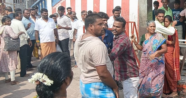 திருவள்ளூர் மாவட்டம் திருத்தணி முருகன் கோயில் மாட வீதியில் வேல் அமைந்துள்ள பகுதியில் காலை பக்தர்கள் தரிசனம் செய்துக் கொண்டிருந்தனர். அங்கு மண கோலத்தில் வந்த இளம் ஜோடி மலர் மாலை மாற்றிக் கொண்டு இளம் பெண் கழுத்தில் தாலி கட்ட முயன்ற போது சினிமா பாணியில் பெண் வீட்டார் மற்றும் வாலிபர் குடும்பத்தினர் அங்கு வந்தனர். மண கோலத்தில் இருந்த பெண்ணை பார்த்த அவரது பெற்றோர் மற்றும் உறவினர்கள் கதறியபடி, எங்களது மகளை கடத்தி வந்து கட்டாய திருமணம் செய்ய பார்ப்பதாக கூச்சலிட்டனர். அங்கிருந்து மணக் கோலத்தில் இருந்த பெண்ணை கட்டாயமாக அழைத்துச் செல்ல பார்த்தபோது வாலிபரின் உறவினர்கள் தடுத்து நிறுத்தியதால் பரபரப்பு நிலவியது. ஒருபுறம் இரு வீட்டார் வாக்குவாதத்தில் இருந்த போதே திடீரென்று கேப்பை பார்த்து இளம் பெண் கழுத்தில் வாலிபர் தாலி கட்டியதால் உச்சகட்ட பரபரப்பு ஏற்பட்டது.