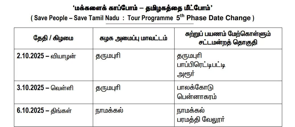 இதுதொடர்பாக அதிமுக பொதுச்செயலாளர் எடப்பாடி பழனிசாமி வெளியிட்டுள்ள அறிக்கையில், “அனைத்திந்திய அண்ணா திராவிட முன்னேற்றக் கழகப் பொதுச் செயலாளர், மாண்புமிகு சட்டமன்ற எதிர்க்கட்சித் தலைவர், தமிழ் நாடு முன்னாள் முதலமைச்சர் ‘புரட்சித் தமிழர்’ திரு. எடப்பாடி K. பழனிசாமி அவர்கள், 'மக்களைக் காப்போம்; தமிழகத்தை மீட்போம்' என்ற உன்னத நோக்கத்தை லட்சியமாகக் கொண்டு, கடந்த 7.7.2025 முதல் சட்டமன்றத் தொகுதி வாரியாக தொடர் பிரச்சார சூறாவளி சுற்றுப் பயணம் மேற்கொண்டு வருகிறார். இந்நிலையில், கழகப் பொதுச் செயலாளர் ‘புரட்சித் தமிழர்' திரு. எடப்பாடி K.பழனிசாமி அவர்கள் 5.10.2025 வரை தொடர் பிரச்சாரம் செய்திடும் வகையில் அறிவிக்கப்பட்டிருந்த, புரட்சித் தமிழரின் எழுச்சிப் பயண ஐந்தாம் கட்ட சுற்றுப் பயணத் திட்டத்தில், 29.9.2025, 30.9.2025 மற்றும் 4.10.2025 ஆகிய தேதிகளில் தருமபுரி, நாமக்கல் மாவட்டங்களில் மேற்கொள்ள இருந்த சுற்றுப் பயணத் திட்டம் ஒத்திவைக்கப்பட்டு, முறையே 2.10.2025, 3.10.2025 மற்றும் 6.10.2025 ஆகிய தேதிகளில் கீழ்க்கண்டவாறு நடைபெறும் என்பதைத் தெரிவித்துக்கொள்கிறோம்.
