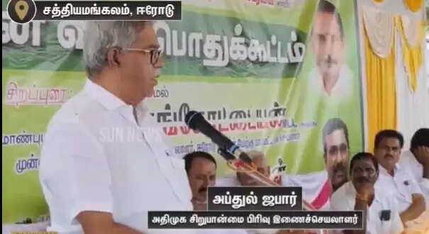 ஈரோடு மாவட்டம் சத்தியமங்கலம் அடுத்த ஆசனூர் மலைப்பகுதி அரேப்பாளையத்தில் மே 1 தொழிலாளர் தினத்திற்கான அதிமுக பொதுக்கூட்டம் நடைபெற்றது. முன்னாள் அமைச்சர் செங்கோட்டையன் தலைமையில் நடைபெற்ற பொதுக்கூட்டத்தில், மாநில சிறுபான்மை பிரிவு இணைச்செயலாளர் அப்துல் ஜபார் பேசிய பேச்சு, சர்ச்சையை ஏற்படுத்தியுள்ளது.