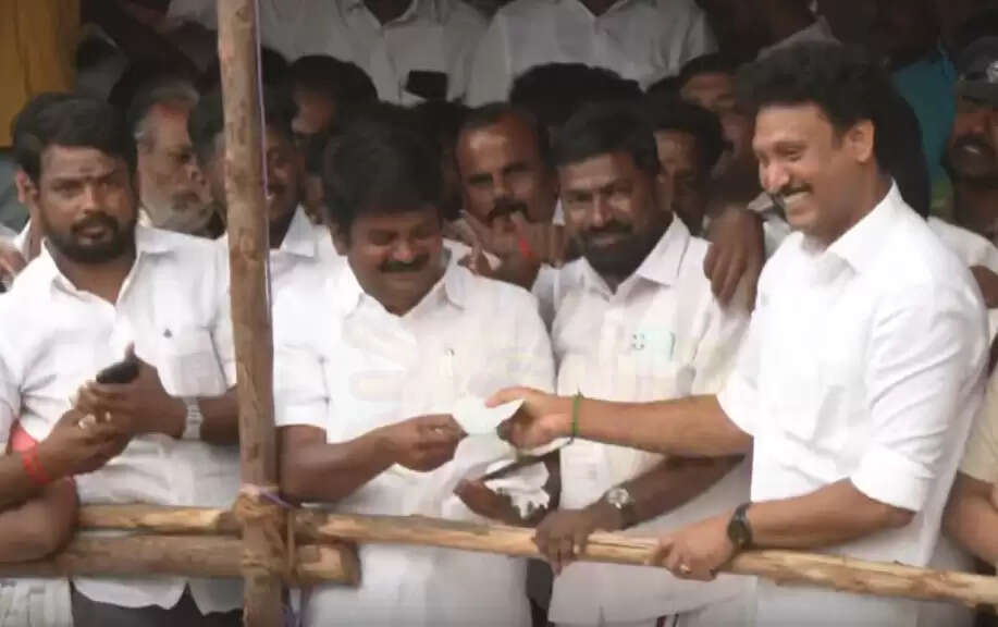திருச்சி, சூரியூர் ஜல்லிக்கட்டில் வெற்றிபெற்ற முன்னாள் அமைச்சர் விஜயபாஸ்கரின் காளைக்கு அமைச்சர் அன்பில் மகேஷ் பரிசு வழங்கினார்.