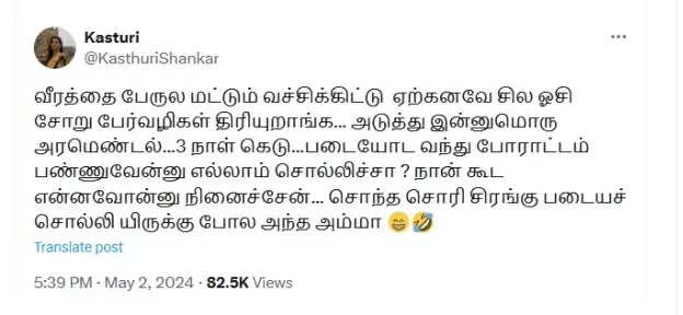 வீரலட்சுமியின் அந்த வீடியோவுக்கு நடிகை கஸ்தூரி பதிலளித்திருந்தார். இது தொடர்பாக அவர் பதிவிட்டு இருந்த ட்வீட்டில், வீரத்தை பேருல மட்டும் வச்சிக்கிட்டு ஏற்கனவே சில ஓசி சோறு பேர்வழிகள் திரியுறாங்க... அடுத்து இன்னுமொரு அரமெண்டல்...3 நாள் கெடு...படையோட வந்து போராட்டம் பண்ணுவேன்னு எல்லாம் சொல்லிச்சா ? நான் கூட என்னவோன்னு நினைச்சேன்... சொந்த சொரி சிரங்கு படையச் சொல்லி யிருக்கு போல அந்த அம்மா... என நக்கலாக பதிவிட்டிருந்தார்.
