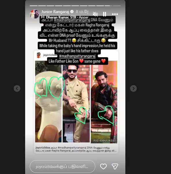 இந்தநிலையில் ஜாய் கிரிசில்டா தனது இன்ஸ்டாகிராம் பக்கத்தில் வெளியிட்டுள்ள பதிவு பரபரப்பை ஏற்படுத்தியது. அதில், `என் மகன், அவன் அப்பா செய்வது போலவே விரல்களை மடக்குகிறான். ஒரே ஜீன். உங்களுக்கு இதை விட வேறென்ன டிஎன்ஏ ஆதாரம் வேணும் மிஸ்டர் கணவரே. சிக்கிட்டீங்க'' என்று தெரிவித்திருக்கிறார்.