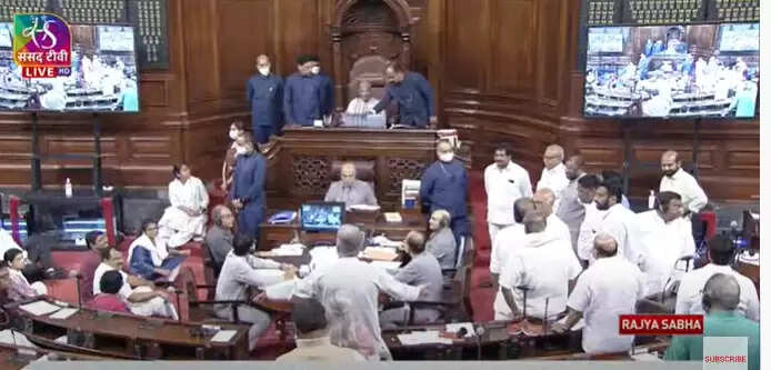 மாநிலங்களவையில் திமுக எம்.பி.க்கள் 4 பேர் சஸ்பெண்ட் செய்யப்பட்டுள்ளனர்.