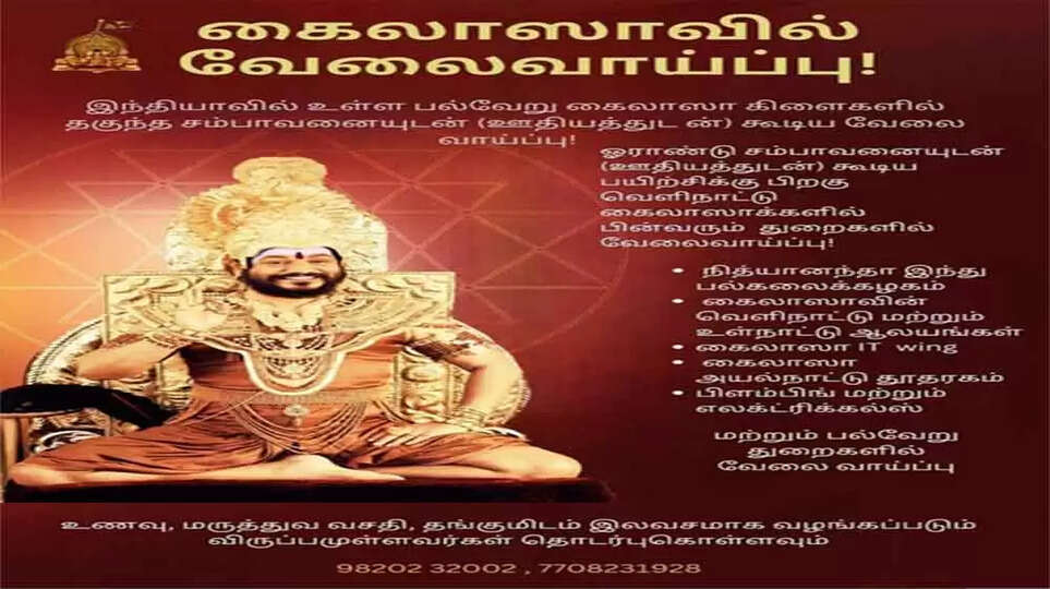 கைலாசாவில் வேலை வாய்ப்பு - உணவு, தங்குமிடம் இலவசம்