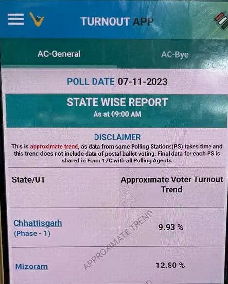 இந்த நிலையில், நடந்து வரும் சத்தீஷ்கர் மற்றும் மிசோரம் சட்டப்பேரவை தேர்தலில் காலை 9 மணி நிலவரப்படி பதிவான வாக்கு சதவீதங்களை தேர்தல் ஆணையம் வெளியிட்டுள்ளது. அதன்படி முதல்கட்ட தேர்தல் நடைபெறும் சத்தீஷ்கரில் காலை 9 மணி நிலவரப்படி 9.93% வாக்குகள் பதிவாகியுள்ளதாக தெரிவிக்கப்பட்டுள்ளது. இதேபோல் மிசோரமில் 12.80% வாக்குகள் பதிவாகியுள்ளதாக தேர்தல் ஆணையம் தெரிவித்துள்ளது.