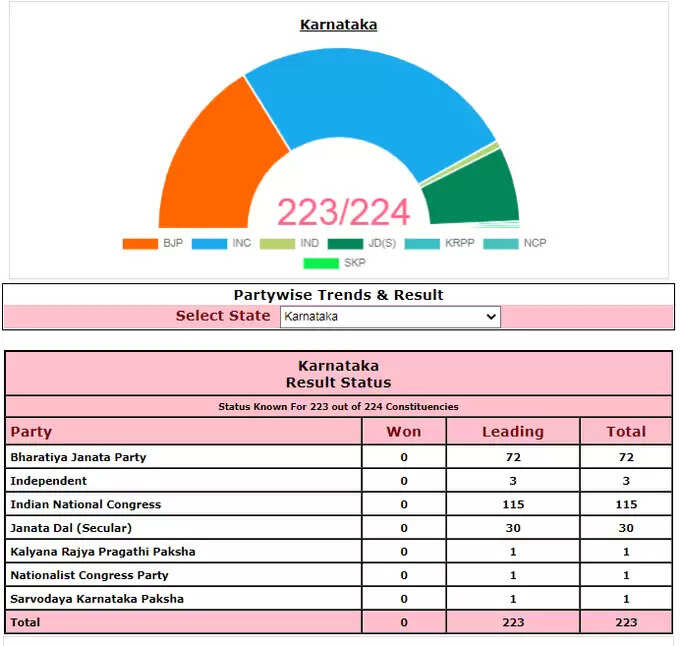 ஆனால் தேர்தல் ஆணையம் வெளியிட்டுள்ள அதிகாரப்பூர்வ அறிவிப்பில், மொத்தமுள்ள 224 தொகுதிகளில் 223 தொகுதிகளின் முன்னிலை நிலவரங்கள் வெளியிடப்பட்டுள்ளது. அதில், காங்கிரஸ் கட்சி 115 இடங்களில் முன்னிலை வகிப்பதாக தெரிவிக்கப்பட்டுள்ளது. பாஜக 72 இடங்களிலும், மஜத 30 இடங்களிலும் முன்னிலையில் உள்ளது. சுயேட்சைகள் 3 இடங்களிலும், பிற கட்சிகள் 3 இடங்களிலும் முன்னிலை வகிக்கின்றன.