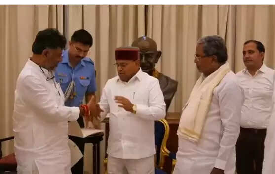#WATCH | Bengaluru: Karnataka CM-designate Siddaramaiah and Deputy CM-designate DK Shivakumar met Governor Thaawarchand Gehlot today to stake claim to form the Government