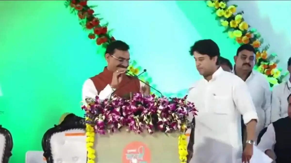அப்போது மத்திய அமைச்சர் ஜோதிராதித்ய சிந்தியா அவர் பின்னால் வேகமாக சென்று ஏதோ கூறினார். உடனே சர்மா புன்னகையுடன் தனது இருக்கைக்கு திரும்பினார். அதேசமயம் ஜோதிராதித்ய சிந்தியா மைக்கில் உடனே பேச தொடங்கினார். இது தொடர்பான வீடியோ இணையத்தில் வெளியாகி மிகவும் வைரலானது. இந்த சம்பவத்தை குறிப்பிட்டு, மற்ற தலைவர்களை ஒரங்கட்டுவது அவரது குடும்ப பாரம்பரியம் என்று கூறி ஜோதிராதித்ய சிந்தியாவை காங்கிரஸ் கடுமையாக சாடியது.