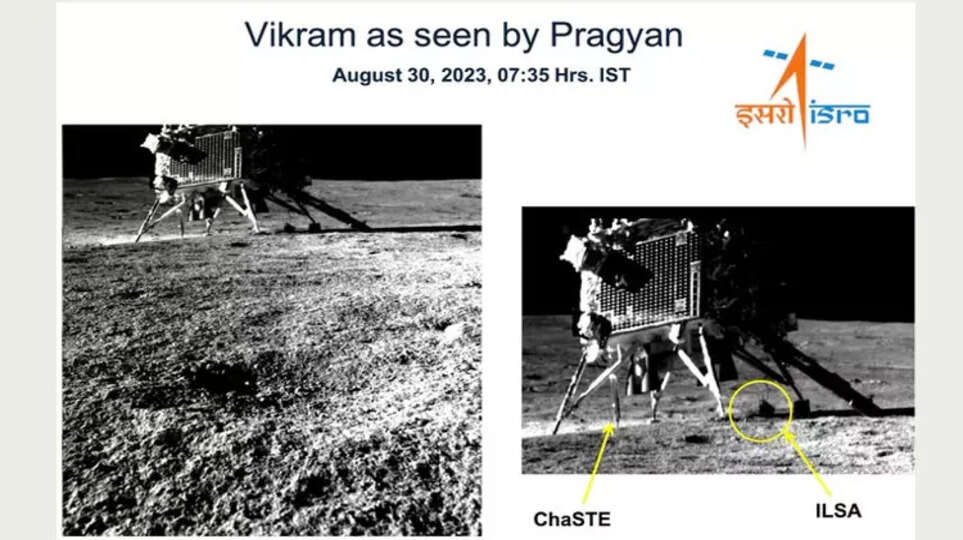 நிலவின் மேற்பரப்பில் ஆய்வுப் பணிகளை மேற்கொண்டுவரும் சந்திரயான் 3-ன் ரோவர், விக்ரம் லேண்டரை புகைப்படம் எடுத்துள்ளது. அந்த புகைப்படத்தை இஸ்ரோ வெளியிட்டுள்ளது.