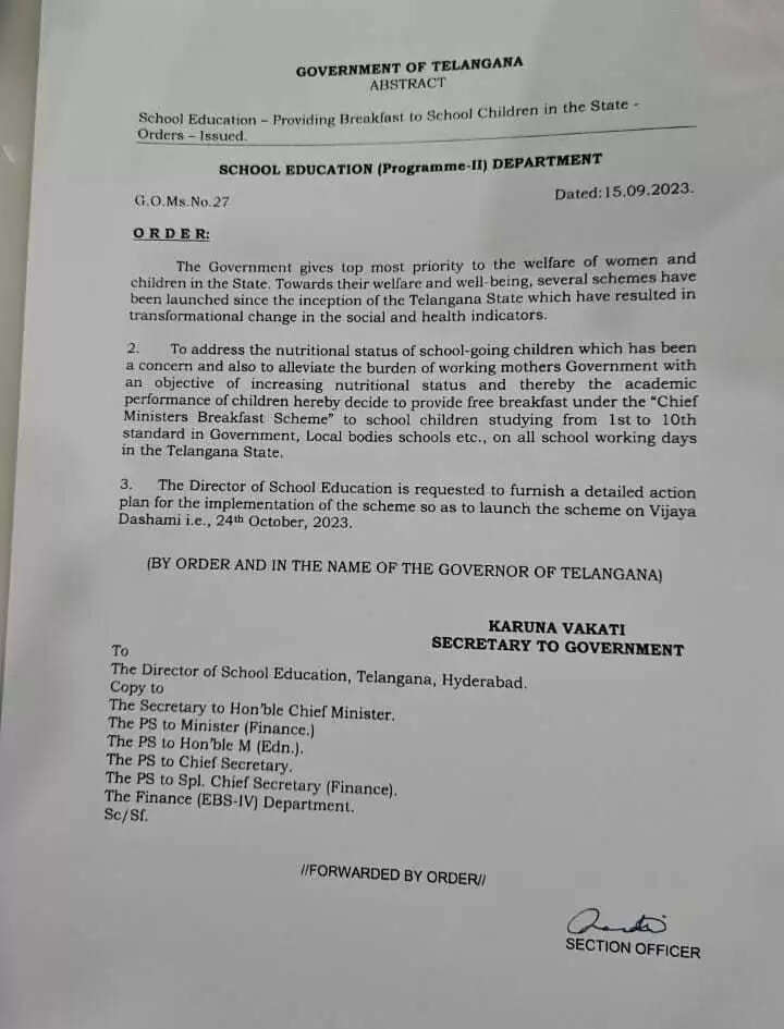 இந்த ஆய்வை தொடர்ந்து தெலுங்கானா முதல்வர் சந்திரசேகர் ராவ் தெலுங்கானா மாநிலத்தில் ஒன்றாம் வகுப்பு முதல் பத்தாம் வகுப்பு வரை படிக்கும் மாணவ, மாணவிகளுக்கு மதிய உணவு வழங்குவது போன்று அக்டோபர் 24ஆம் தேதி விஜயதசமி முதல் காலை சிற்றுண்டி வழங்கும் விதமாக உத்தரவிட்டுள்ளார். இதற்கான அரசாணை இன்று வெளியிடப்பட்டுள்ளது. தமிழக அரசு கொண்டு வந்துள்ள காலை சிற்றுண்டி திட்டம் மற்ற மாநிலங்களுக்கும் முன்னொடி திட்டமாக மாறி உள்ளது.