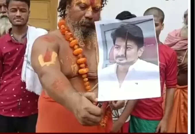 தமிழ்நாடு அமைச்சர் உதயநிதி ஸ்டாலின் படத்தை வாளால் கிழித்து தீயிட்டு கொளுத்தியதோடு, அவரது தலைக்கு 10 கோடி ரூபாய் என அறிவித்துள்ள உத்திரப்பிரதேசத்தை சேற்ந்த சாமியாரால் பரபரப்பு ஏற்பட்டுள்ளது.