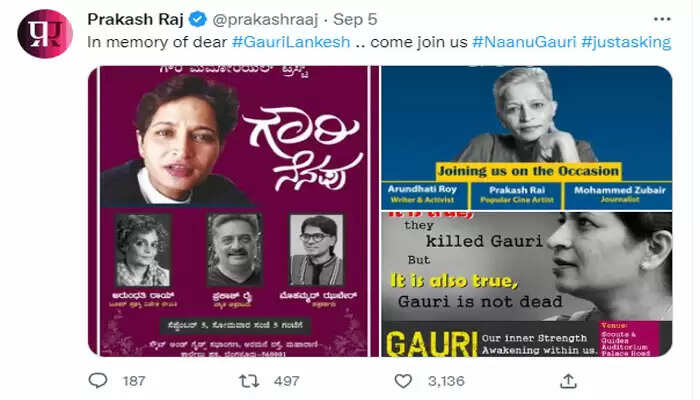 பத்திரிக்கையாளர் கௌரி லங்கேஷ், நடிகர் பிரகாஷ்ராஜின் நலம் விரும்பியதாக இருந்தார். அவர் சுட்டுக் கொல்லப்பட்டதும் இந்த விவகாரத்தில் மௌனம் காத்து பிரதமர் மோடியை, பிரகாஷ்ராஜ் தொடர்ந்து கேள்வி கேட்டார். பாஜகவை தொடர்ந்து எதிர்த்து பேசி வருகிறார் பிரகாஷ்ராஜ்.