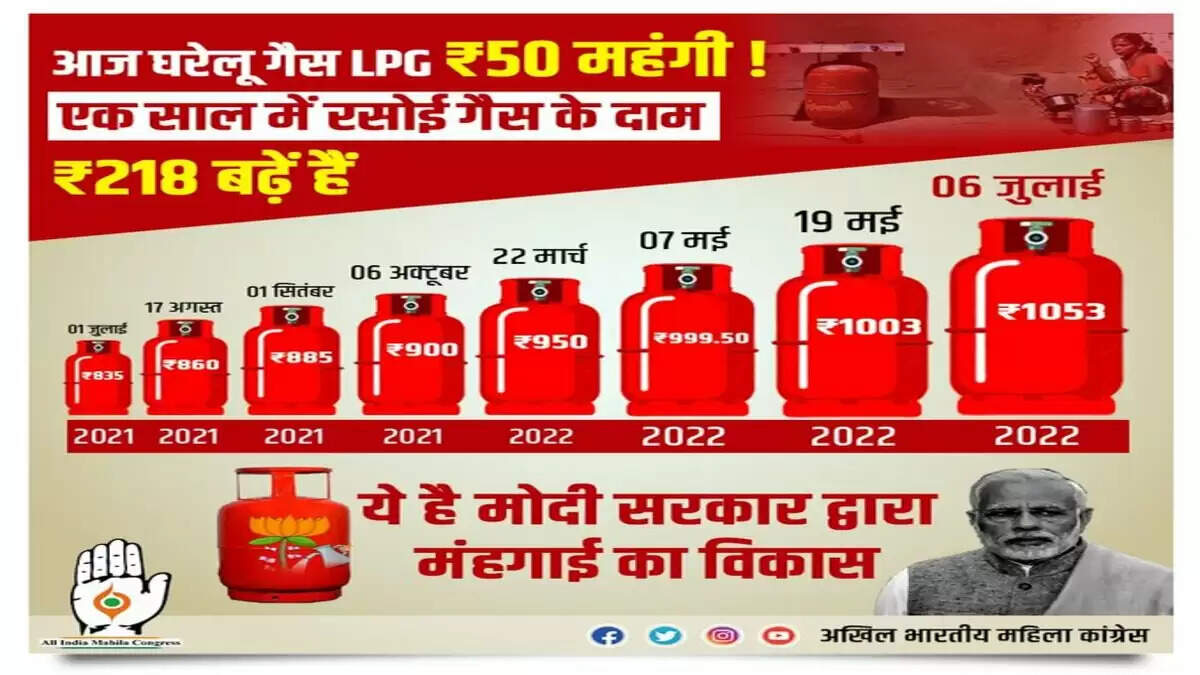 அகில இந்திய மகளிர் காங்கிரஸ் டிவிட்டரில், எல்.பி.ஜி. கேஸ் சிலிண்டர் விலை மேலும் ரூ.50 உயர்வு, மகாராஷ்டிரா அரசை கவிழ்க்க செய்த செலவா இது? என்று பதிவு செய்துள்ளது. காங்கிரஸ் செய்தி தொடர்பாளர் ராகினி நாயக் கூறியதாவது: பிரதமர் மோடியின் ஆட்சியில் பெட்ரோல், டீசல் விலை உயராமல் இருப்பதும், பணவீக்கத்தால் மக்களின் முதுகு உடைக்கப்படாமல் இருந்தால் மிகப்பெரிய ஆச்சரியம். பிரதமர் மோடியின் மிகப்பெரிய சாதனை, நாட்டை எல்லா வகையிலும் ஏமாற்றி வெற்றி பெற்றுள்ளது. ஒரு காலத்தில் சீனாவுக்கு சிகப்பு கண் காட்டுவதாக பிரதமர் பேசியிருந்தார், பணவீக்கத்துக்கு எப்போது அவர் சிவப்புக் கண் காட்டுவார் என நாடே காத்திருக்கிறது.