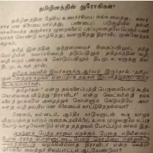 ’கொள்கையற்ற குழப்பவாதிகள் என்கிற தலைப்பில் மேற்கண்டவை இடம்பெற்றுள்ளன. ’தமிழினத்தின் துரோகிகள்’ என்கிற தலைப்பில், ’’தமிழினத்தின் தேசிய உணர்ச்சியை மங்க வைத்து கலாச்சார மனநிலையை மாய்த்து பண்பை படுகுழியில் தள்ளி நாகரிகமற்ற முறைகளை பரப்புவதையே பெரும் பணியாக கொண்டு வாழ்கிறது வளர்கிறது திராவிட முன்னேற்றக் கழகம்.
