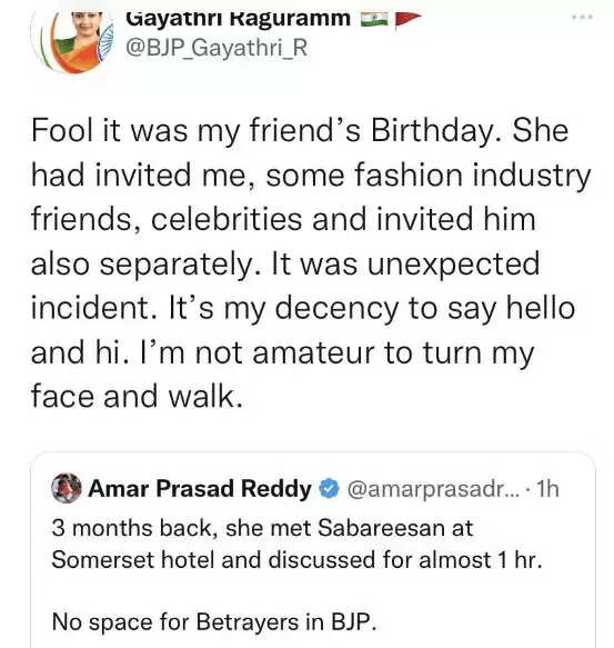 அமர் பிரசாத்தின் இந்த குற்றச்சாட்டுக்கு பதில் அளித்துள்ள காயத்ரி ரகுராம்,   முட்டாளே அது என் நண்பரின் பிறந்தநாள்.  அவர் என்னையும் சில பேசன் நண்பர்களையும் அழைத்து இருந்தார் .  சபரீசன் உள்ளிட்ட பலரையும் அழைத்து இருக்கின்றார்.   அது ஒரு எதிர்பாராத சம்பவம்.   ஹாய் மற்றும் ஹலோ சொல்வது என் டீசென்சி.  முகத்தை திருப்பிக் கொண்டு போக நான் முதிர்ச்சியற்றவள் அல்ல.  பிரதமர் மோடி கூட அரசு விவகாரங்களில் ஸ்டாலினை சந்திக்கிறார் என்று கூறியிருக்கிறார்.