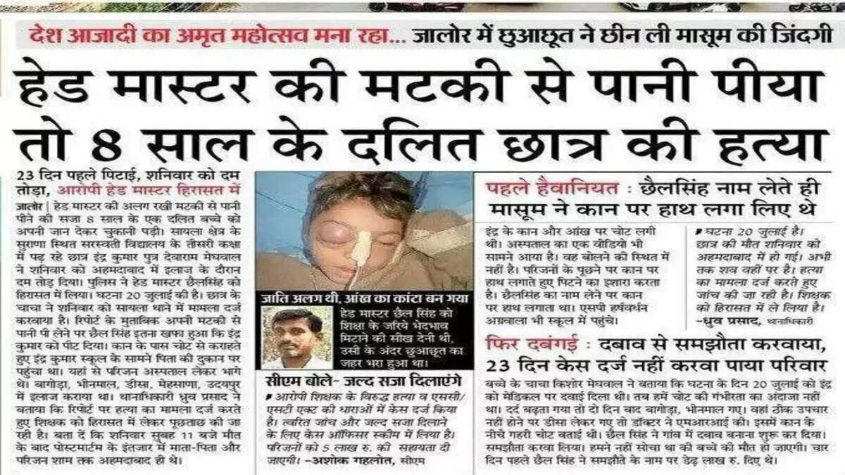 ராஜஸ்தான் மாநிலம் ஜலோர் மாவட்டத்தில் பள்ளி ஒன்றில் 8 வயது தலித் மாணவன் ஒருவன் தலைமை ஆசிரியரின் பாத்திரத்தில் இருந்த தண்ணீரை குடித்துள்ளார். இதனையடுத்து அந்த தலைமை ஆசிரியர் அந்த மாணவனை தாக்கியதாக கூறப்படுகிறது. காயம் அடைந்த மாணவன் மருத்துவமனையில் அனுமதிக்கப்பட்டார். இருப்பினும் அந்த மாணவன் சிகிச்சை பலன் இன்றி கடந்த சனிக்கிழமையன்று உயிர் இழந்தார். இந்த சம்பவம் அங்கு கொந்தளிப்பை ஏற்படுத்தியுள்ளது.