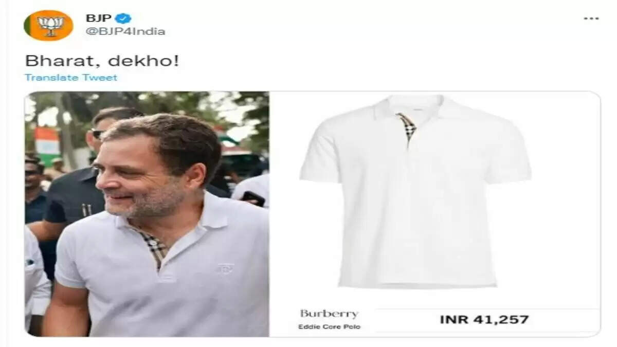பா.ஜ.க.வின் டிவிட்டர் பக்கத்தில், பாரதம் பார்த்துக் கொண்டிருக்கிறது என்ற தலைப்பில் ஒரு படம் பதிவேற்றம் செய்து இருந்தது. அதில் ராகுல் காந்தி வெள்ளை நிற டி-சர்ட் அணிந்து யாத்திரையில் பங்கேற்ற படமும், பர் பெர்ரி பிராண்ட் டி-சர்ட் படமும் அதன் கீழ் அதன் விலை ரூ.41,257 என குறிப்பிடப்பட்டுள்ளது. அதாவது ராகுல் காந்தி ரூ.41 ஆயிரம் டி-சர்ட் அணிந்து யாத்திரை பங்கேற்கிறார் என்று பா.ஜ.க. விமர்சனம் செய்துள்ளது.