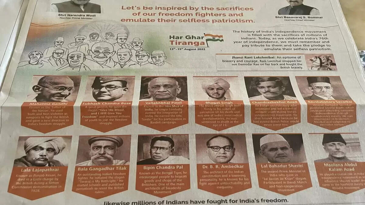 கர்நாடகாவில் முதல்வர் பசவராஜ் பொம்மை தலைமையில் பா.ஜ.க. ஆட்சி நடைபெற்று வருகிறது. கர்நாடாக பா.ஜ.க. அரசு, வீடுகளில் தேசியக் கொடி  பிரச்சாரத்தை முன்னிலைப்படுத்த பத்திரிகையில் முழு பக்க அளவில் விளம்பரம் செய்து இருந்தது. அந்த விளம்பரத்தில் இந்திய சுதந்திர போராட்ட வீரர்களின் படங்கள் இடம் பெற்று இருந்தன. அதில் நாட்டின் முதல் பிரதமரான ஜவஹர்லால் நேரு இடம் பெறவில்லை. இதற்கு காங்கிரஸ் கட்சி கடும் கண்டனம் தெரிவித்துள்ளது.