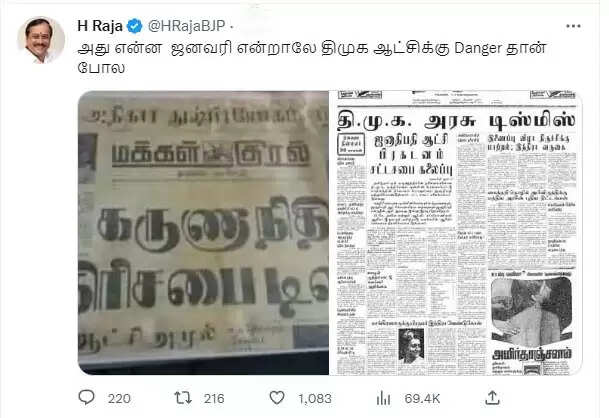 இந்த நிலையில், ’அது என்ன ஜனவரி என்றாலே திமுக ஆட்சிக்கு டேஞ்சர் தான் போல’ என்று எச். ராஜா தனது ட்விட்டர் பக்கத்தில் இரண்டு நாளிதழ் தலையங்க பக்கங்களை வெளியிட்டு இருக்கிறார். கருணாநிதி முதல்வராக இருந்த போது திமுக அரசு டிஸ்மிஸ் செய்யப்பட்ட செய்தி அது. ‘திமுக அரசு டிஸ்மிஸ் -ஜனாதிபதி ஆட்சி பிரகடனம்-சட்டசபை கலைப்பு’ என்றும், ’லஞ்சம் -அதிகார துஷ்பிரயோகம் -பிரிவினை- கருணாநிதி மந்திரி சபை டிஸ்மிஸ்! ஜனாதிபதி ஆட்சி அமல்’ என்றும் அந்த நாளிதழ்களில் தலைப்புச் செய்தியாக இடம் பெற்று இருக்கிறது.