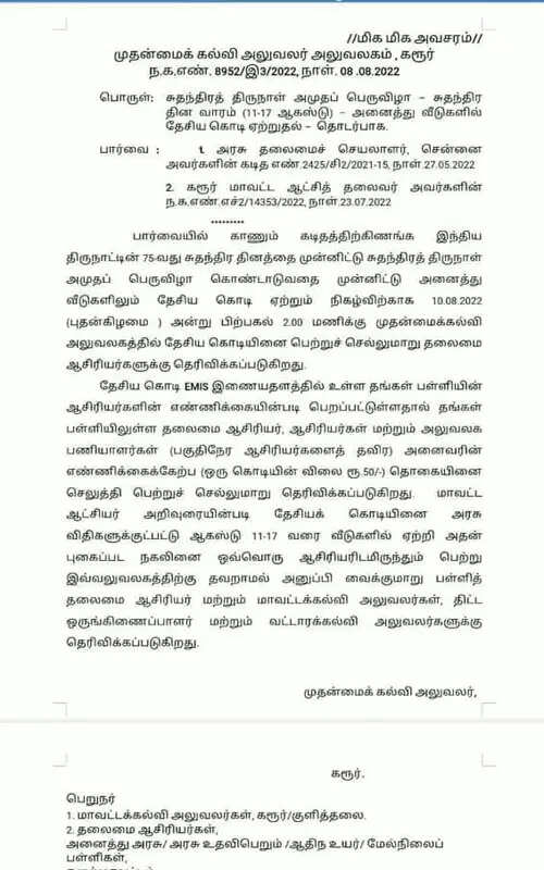 மாவட்ட ஆட்சியர் அறிவுரையின் படி தேசிய கொடியினை அரசு விதிகளுக்கு உட்பட்டு ஆகஸ்ட் 11ஆம் தேதி முதல் 17ஆம் தேதி வரை வீடுகளில் ஏற்றி அதன் புகைப்படங்களையும் ஒவ்வொரு ஆசிரியரிடம் இருந்தும் பெற்று அலுவலகத்திற்கு தவறாமல் அனுப்பி வைக்குமாறு பள்ளி தலைமை ஆசிரியர் மற்றும் மாவட்ட கல்வி அலுவலர்கள் திட்ட ஒருங்கிணைப்பாளர் மற்றும் வட்டார கல்வி அலுவலர்களுக்கு தெரிவிக்கப்படுகிறது’’ என்று கரூர் மாவட்ட முதன்மை கல்வி அலுவலர் அனுப்பிய கடிதத்தை ஆதாரமாக காட்டி,