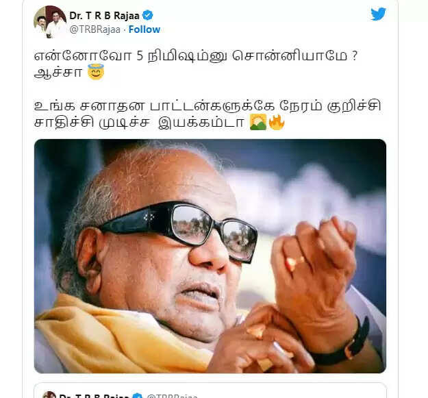 இதற்கு திமுக எம்.எல்.ஏ. டிஆர்பி ராஜா பதிலடி கொடுத்திருக்கிறார். அவர், ‘’என்னோவோ 5 நிமிஷம்னு சொன்னியாமே ? ஆச்சா? உங்க சனாதன பாட்டன்களுக்கே நேரம் குறிச்சி சாதிச்சி முடிச்ச இயக்கம்டா!’’ என்கிறார்.