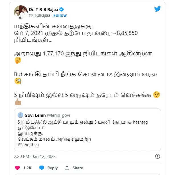 அவர் மேலும், ‘’மந்திகளின் கவனத்துக்கு: மே 7, 2021 முதல் தற்போது வரை ~8,85,850 நிமிடங்கள்... அதாவது 1,77,170 ஐந்து நிமிடங்கள் ஆகின்றன. But சங்கி தம்பி நீங்க சொன்ன டீ இன்னும் வரல. 5 நிமிஷம் இல்ல 5 வருஷம் தரோம் வெச்சுக்க’’என்கிறார்.