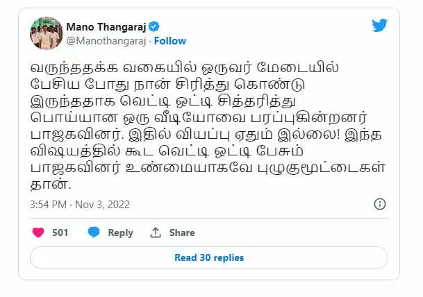 வருந்ததக்க வகையில் ஒருவர் மேடையில் பேசிய போது நான் சிரித்து கொண்டு இருந்ததாக வெட்டி ஒட்டி சித்தரித்து பொய்யான ஒரு வீடியோவை பரப்புகின்றனர் பாஜகவினர். இதில் வியப்பு ஏதும் இல்லை! இந்த விஷயத்தில் கூட வெட்டி ஒட்டி பேசும் பாஜகவினர் உண்மையாகவே புழுகுமூட்டைகள் தான்.’’என்று தெரிவித்திருக்கிறார்.