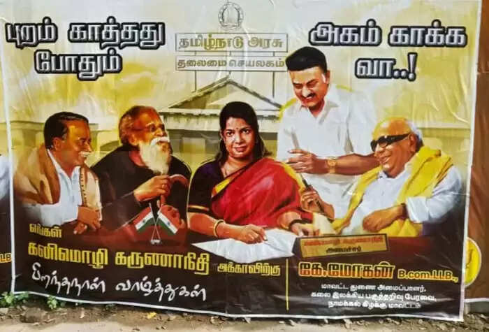 நாமக்கல் கிழக்கு மாவட்ட கலை இலக்கிய பகுத்தறிவு பேரவை மாவட்ட துணை அமைப்பாளர் கே. மோகன் சார்பில் அந்த போஸ்டர் ஒட்டப்பட்டுள்ளது. அந்த போஸ்டரில் பெரியார், அண்ணா, கலைஞர் , ஸ்டாலின் ஆகியோர் கனிமொழியை நாற்காலியில் அமர வைத்து பெருமிதம் கொள்கிறார்கள். கனிமொழி கையெழுத்து போட கலைஞர் பேனா எடுத்துக் கொடுக்கிறார். இதன் பின்னணியில் தலைமைச் செயலகம் உள்ளது.