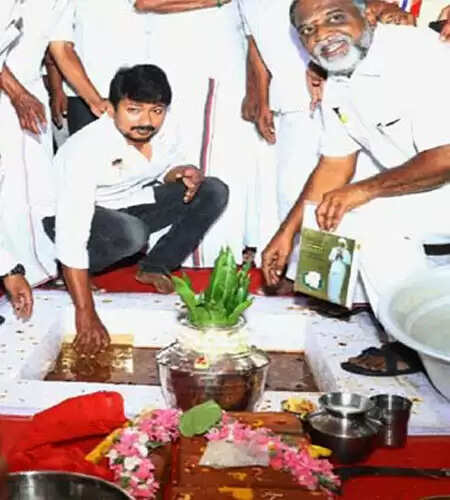 தஞ்சாவூர் மாவட்டம் கும்பகோணத்தில் கடந்த ஜூன் 27ஆம் தேதி நடந்த வடக்கு மாவட்ட திமுக அலுவலக கட்டட அடிக்கல் விழாவில் உதயநிதி ஸ்டாலின் எம்எல்ஏ பூமி பூஜையில் பங்கேற்று இந்து மத பூஜைப்படி செய்து கொடுக்கப்பட்ட செங்கல்லை அடிக்கல் நாட்டினார். அமைச்சர் ஆர். காந்தி கிருஷ்ணகிரி நகராட்சி சின்ன ஏரி மேம்படுத்தும் பணி நகர்ப்புற மேம்பாட்டு திட்ட பணிகளுக்கு பூமி பூஜை செய்து தொடங்கி வைத்துள்ளார்.