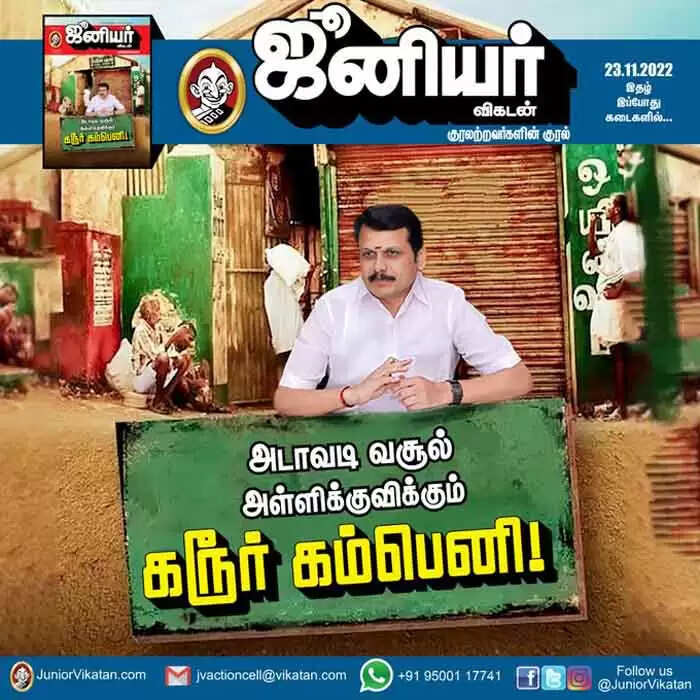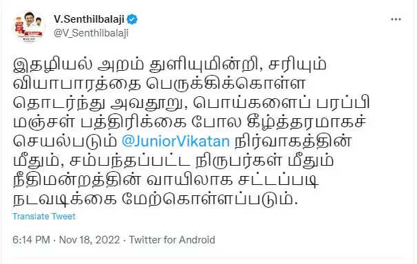 இந்த நிலையில், அடாவடி வசூல்.. அள்ளிக்குவிக்கும் கரூர் கம்பெனி.. என்று ஜூனியர் விகடனில் அமைச்சர் செந்தில்பாலாஜி குறித்து கட்டுரை வெளிவந்திருக்கிறது. இதற்கு, ‘’இதழியல் அறம் துளியுமின்றி, சரியும் வியாபாரத்தை பெருக்கிக்கொள்ள தொடர்ந்து அவதூறு, பொய்களைப் பரப்பி மஞ்சள் பத்திரிக்கை போல கீழ்த்தரமாகச் செயல்படும் ஜூனியர் விகடன் நிர்வாகத்தின் மீதும், சம்பந்தப்பட்ட நிருபர்கள் மீதும் நீதிமன்றத்தின் வாயிலாக சட்டப்படி நடவடிக்கை மேற்கொள்ளப்படும்’’ என்று தெரிவித்திருக்கிறார் அமைச்சர் செந்தில்பாலாஜி.