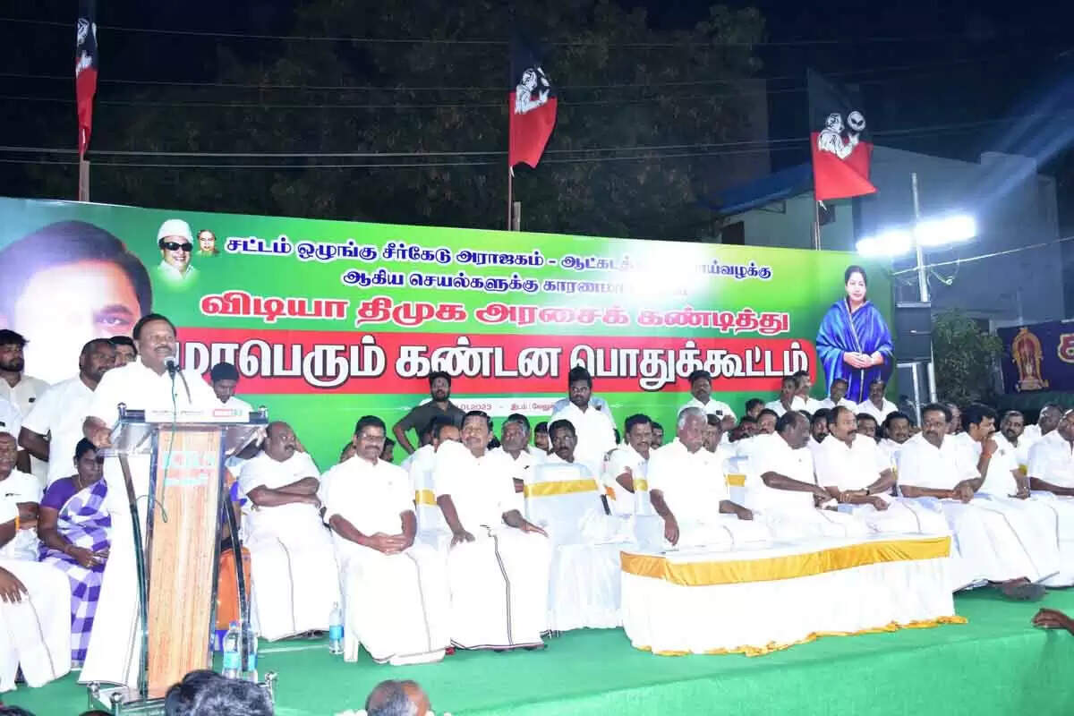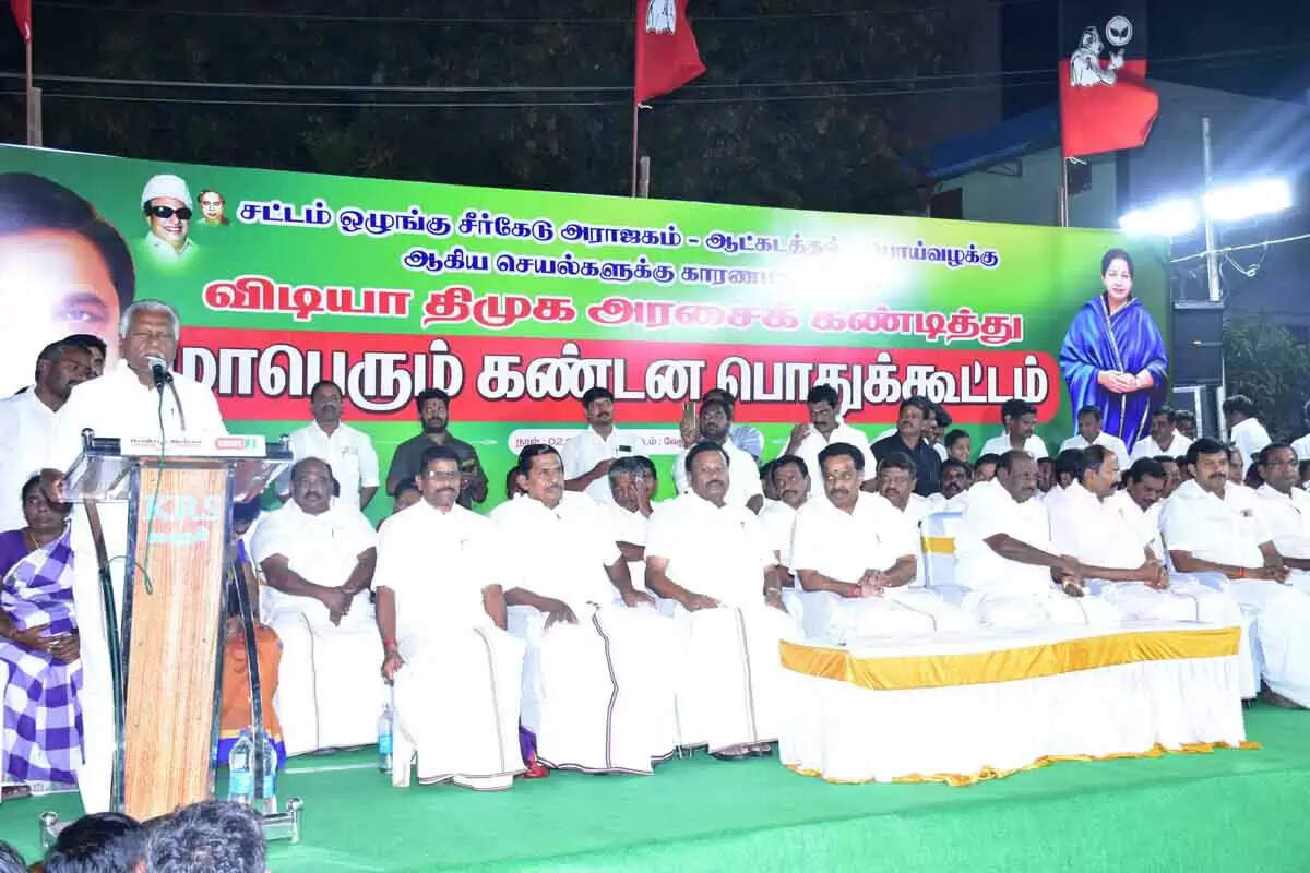திமுக அரசை கண்டித்து அதிமுக சார்பில் கரூரில் கண்டன பொதுக்கூட்டம் நடந்தது. இந்த பொதுக்கூட்டத்தில் முன்னாள் அமைச்சர்கள் தங்கமணி, திண்டுக்கல் சீனிவாசன், கே. பி. முனுசாமி, நத்தம் விஸ்வநாதன், எம். ஆர். விஜயபாஸ்கர் உள்ளிட்டோர் பங்கேற்று கண்டன உரையாற்றினார்கள் .