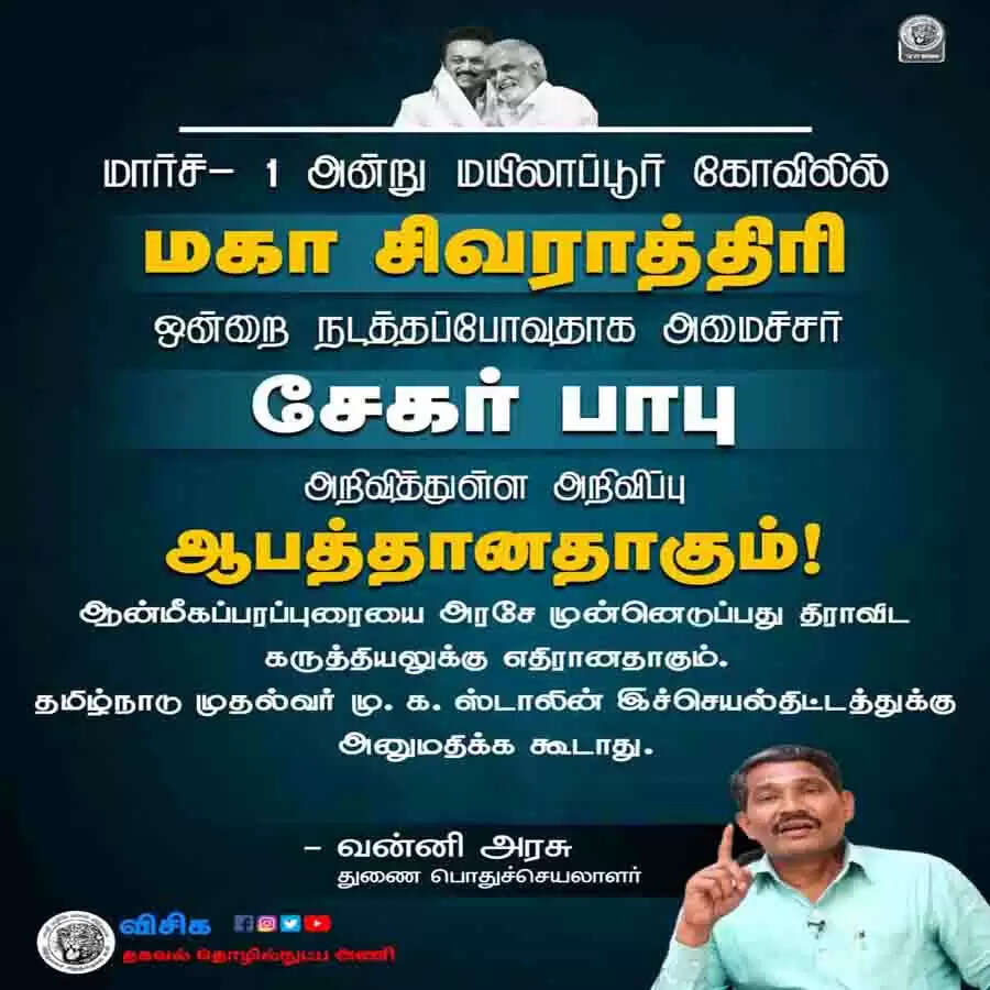 இதற்கு எதிர்ப்பு தெரிவித்திருக்கிறார் திமுக கூட்டணியில் இருக்கும் விடுதலை சிறுத்தைகள் கட்சியின் துணை பொதுச்செயலாளரான வன்னியரசு, மார்ச்1 அன்று மயிலாப்பூர கோவிலில் மகா சிவராத்திரி ஒன்றை நடத்தப்போவதாக அமைச்சர் பிகே சேகர்பாபு, அறிவித்துள்ள அறிவிப்பு ஆபத்தானதாகும். ஆன்மீகப் பரப்புரையை அரசே முன்னெடுப்பது திராவிட கருத்தியலுக்கு எதிரானதாகும். தமிழ்நாடு முதல்வர் இச்செயல்திட்டத்துக்கு அனுமதிக்க கூடாது என்று கேட்டுக்கொண்டிருக்கும் அவர், சனாதனக்கும்பலுக்கு ஆதரவான மகா சிவராத்திரி...இது திராவிட மாடலா?ஆரிய மாடலா? என்ற கேள்வியை எழுப்பி இருக்கிறார்.