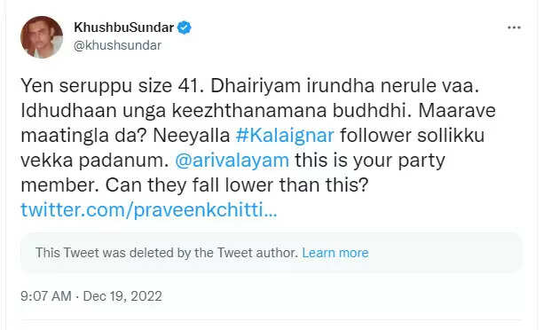 இதைக்கண்டு ஆவேசம் அடைந்த குஷ்பு, ‘’என் செருப்பு சைஸ் 41. தைரியம் இருந்த நேருல வா. இதுதான் உங்க கீழ்த்தனமான புத்தி. மாறவே மாட்டீ ங்களாடா? நீயெல்லாம் கலைஞரை பாலோவ் செய்யறேன்னு சொல்லிக்க வெட்கப் படணும். இவர் திமுக கட்சி உறுப்பினர். இவர்களால் இதைவிடத்தரம் தாழ்ந்து போய்விட முடியுமா?’’என்று கேட்டிருக்கிறார்.
