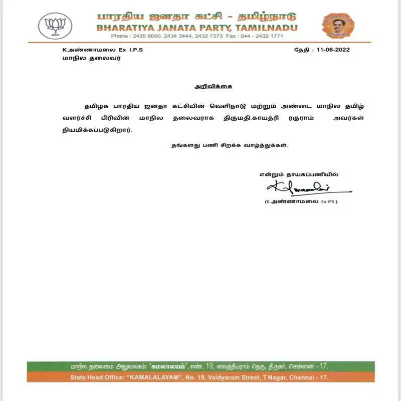 இந்த நிலையில் காயத்ரி ரகுராமுக்கு புதிய பொறுப்பு வழங்கிய அறிவித்திருக்கிறார் அண்ணாமலை. தமிழக பாரதிய ஜனதா கட்சியின் வெளிநாடு மற்றும் அண்டை மாநில தமிழ் வளர்ச்சி பிரிவில் மாநில தலைவராக காயத்ரி ரகுராம் நியமிக்கப்படுகிறார். அவரது பணி சிறக்க வாழ்த்துக்கள் என்று தெரிவித்திருக்கிறார் அண்ணாமலை.
