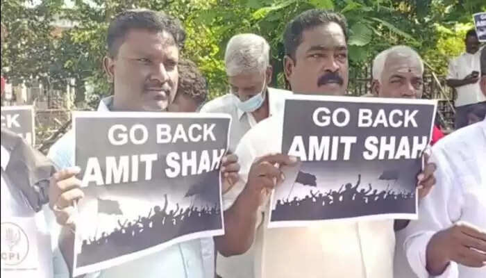 அமித்ஷாவுக்கு எதிர்ப்பு தெரிவித்து காங்கிரஸ், விசிக, கம்யூனிஸ்டுகள், திக என்று மதசார்பற்ற முற்போக்கு கூட்டணி கட்சிகள் கருப்புக்கொடி ஆர்ப்பாட்டம் நடத்தினார்கள். அமித்ஷாவே திரும்பி போ என்று பதாகைகள் ஏந்தி இந்த ஆர்ப்பாட்டம் நடத்தினர். அமித்ஷா வருவதை முன்னிட்டு நேற்றைய தினமே என்ற ஹேஷ்டேக்கினை தேசிய அளவில் டுவிட்டரில் டிரெண்ட் செய்து வந்தனர். இந்நிலையில் நேரிலும் இன்று எதிர்ப்பு தெரிவித்தனர்.