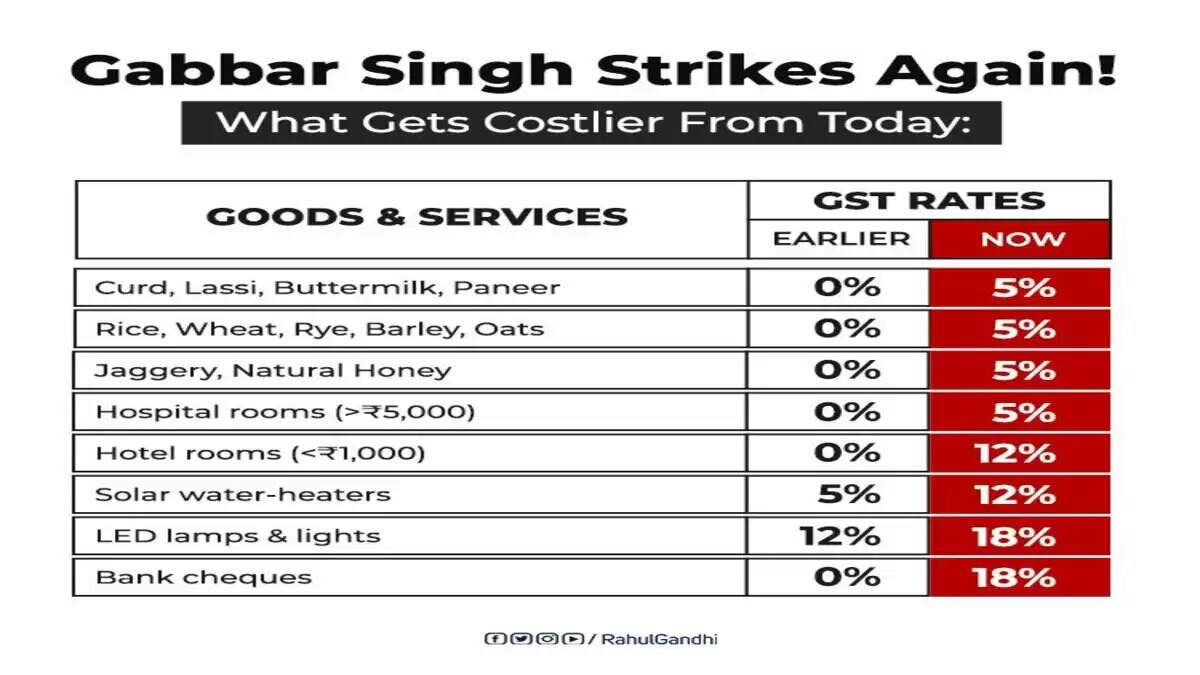கடந்த மாதம் நடந்த ஜி.எஸ்.டி. கவுன்சில் கூட்டத்தில், முன்கூட்டியே பேக் செய்யப்பட்ட ஆட்டா, பன்னீர், தயிர், அரிசி உள்ளிட்ட சில்லறை உணவுப் பொருட்கள் மீது 5% வரியும், காசோலைகள் வழங்க வங்கிகள் வசூலிக்கும் கட்டணத்திற்கு 18 சதவீதமும், மருத்துவமனையில் அறை வாடகை (தீவிர சிகிச்சை பிரிவு தவிர்த்து) நோயாளி ஒருவருக்கு, நாளொன்றுக்கு ரூ.5000க்கு மேல் வசூலிக்கப்படும் தொகைக்கு 5 சதவீதமும், அட்லஸ் உள்ளிட்ட வரைபடங்களுக்கு 12 சதவீதமும் வரி விதிக்க முடிவு செய்யப்பட்டது. அதன்படி புதிய திருத்தப்பட்ட ஜி.எஸ்.டி. வரி நேற்று முதல் அமலுக்கு வந்தது. இதற்கு காங்கிரஸ் கடும் எதிர்ப்பு தெரிவித்துள்ளது.