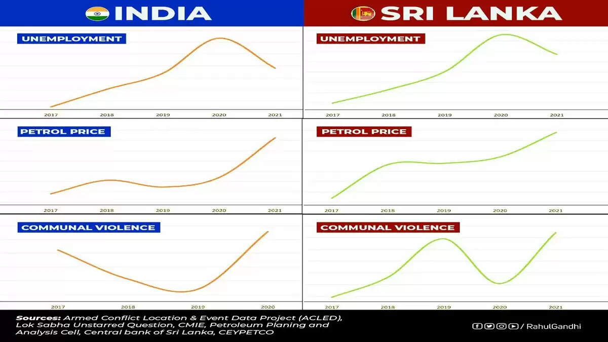 காங்கிரஸ் கட்சியின் முன்னாள் தலைவர் ராகுல் காந்தி, இந்தியாவின் தற்போதைய நிலைமை, பொருளாதார வீழ்ச்சியை சந்தித்துள்ள இலங்கையை போல் உள்ளதாக குற்றம் சாட்டினார். ராகுல் காந்தி தனது டிவிட்டரில், 3 செட் கிராப்களை பதிவேற்றம் செய்து, மக்களை திசை திருப்புவது உண்மைகளை மாற்றாது. இந்தியா இலங்கையை போல் தெரிகிறது என பதிவு செய்துள்ளார்.