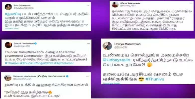இந்த நிலையில், உதயநிதி ஸ்டாலின் வாங்கி வெளியிடுவதாக சொல்லபடும், அதே நேரம் போனி கபூர் பெயரில் படத்தையே தயாரித்ததாகவும் சொல்லப்படும் துணிவு திரைப்படத்தில் ஆளுநரை தாக்கி பேசுவது மாதிரி, ஆளுநர் ஆர்.என்.ரவிக்கு எச்சரிக்கை விடுவது மாதிரி டயலாக் ஒன்று இடம்பெற்றுள்ளது. இதை ரசிகர்கள் வலைத்தளங்களில் வைரலாக்கி வருகின்றனர்.