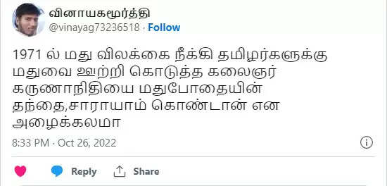 சுந்தரவல்லியின் இந்த டுவிட்டர் பதிவுக்கு ஆதரவை விட எதிர்ப்பு வலுத்து வருகிறது. 1971 ல் மது விலக்கை நீக்கி தமிழர்களுக்கு மதுவை ஊற்றி கொடுத்த கலைஞர் கருணாநிதியை மதுபோதையின் தந்தை,சாராயம் கொண்டான் என அழைக்கலமா? என்று கேட்கிறார்கள்.