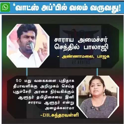 ’’சாராய அமைச்சர் செந்தில் பாலாஜி என்றார் அண்ணாமலை. 50 மது வகைகளை புதிதாக தீபாவளிக்கு அறிமுகம் செய்த புதுச்சேரி அரசை நிர்வகிக்கும் ஆளுநர் தமிழிசையை இனி சாராய ஆளுநர் என்று அழைக்கலாமா ? என்று கேட்டிருக்கிறார் டாக்டர் சுந்தரவள்ளி என்பவர்.