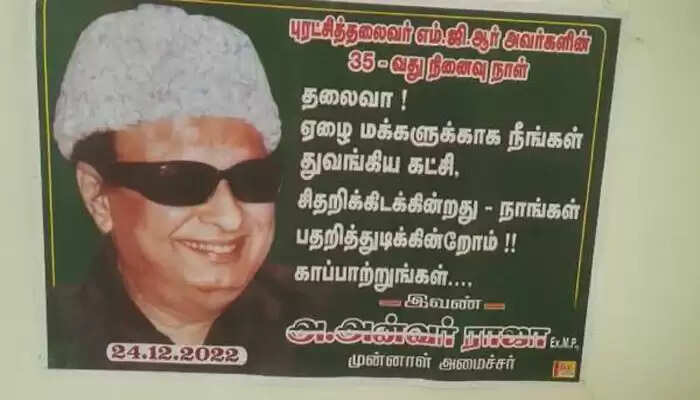 கட்சி சிதறி கிடக்கின்றது நாங்கள் பதறி துடிக்கின்றோம் காப்பாற்றுங்கள் தலைவா என்று போஸ்டர் ஒட்டி பரபரப்பை ஏற்படுத்தி இருக்கிறார் அதிமுக முன்னாள் அமைச்சர் அன்வர் ராஜா. அதிமுகவின் நிறுவனர் எம்ஜிஆரின் 35 வது நினைவு நாள் வரும் 24ஆம் தேதி அனுசரிக்கப்படுகிறது. இதை முன்னிட்டு ராமநாதபுரத்தில் அன்வர் ராஜா இப்படி போஸ்ட் போஸ்டர் ஒட்டி பரபரப்பை ஏற்படுத்தி இருக்கிறார்.