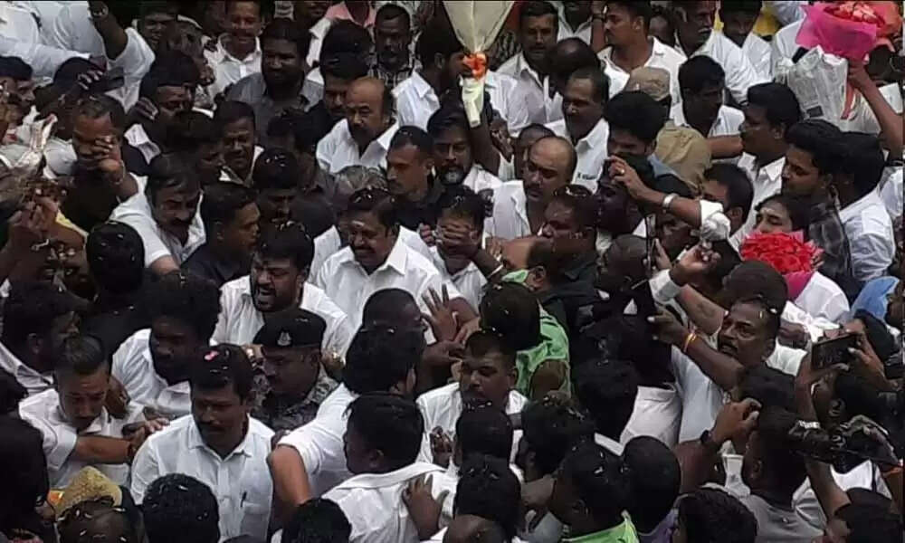 அதிமுகவின் இடைக்கால பொதுச்செயலாளராக தேர்வு செய்யப்பட்ட பின்னர் 72 நாட்களுக்கு பின்னர் எடப்பாடி பழனிச்சாமி இன்று அதிமுக தலைமை அலுவலகம் சென்றார். அவருக்கு தடபுடலான வரவேற்பு வழங்கினர் கட்சியினர்.