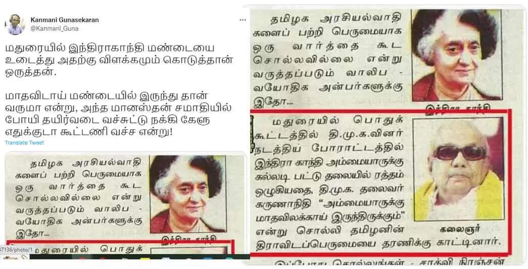 இதற்கு தமிழக பாஜக துணைத்தலைவர் நாராயணன் திருப்பதி பதிலடி கொடுத்திருக்கிறார். அவர், ‘’இந்திரா காந்தியை மதுரையில் திமுகவினர் தாக்கி விட்டு ரத்தம் சொட்ட சொட்ட அவர் நின்ற போது, அது குறித்து உங்கள் தலைவர் சொன்ன அரசியல் அசிங்கமும், காங்கிரஸ் சட்டமன்ற உறுப்பினர் அனந்தநாயகியிடம் கேட்ட கேள்வியும், திமுகவின் பண்பாடு குறித்தும், கலாச்சாரம் குறித்தும் பறை சாற்றும்’’என்கிறார்.