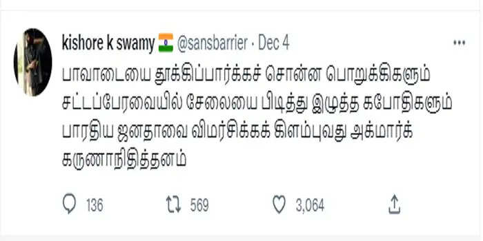 திமுக மீது கிஷோர் கே.சாமி, ’’பாவாடையை தூக்கிப்பார்க்கச் சொன்ன பொறுக்கிகளும் சட்டப்பேரவையில் சேலையை பிடித்து இழுத்த கபோதிகளும் பாரதிய ஜனதாவை விமர்சிக்கக் கிளம்புவது அக்மார்க் கருணாநிதித்தனம்’’ விமர்சனம் செய்திருந்ததையும் இந்த விவகாரத்தில் எடுத்து பரப்புகின்றனர் பாஜகவினர்.