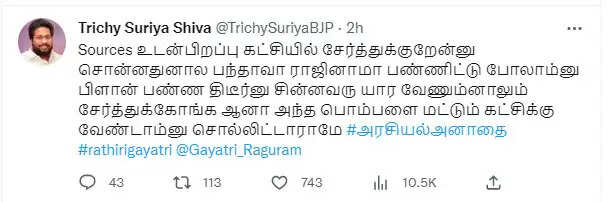 ’’உடன்பிறப்பு கட்சியில் சேர்த்துக்குறேன்னு சொன்னதுனால பந்தாவா ராஜினாமா பண்ணிட்டு போலாம்னு பிளான் பண்ண. திடீர்னு சின்னவரு யார வேணும்னாலும் சேர்த்துக்கோங்க. ஆனா அந்த பொம்பளை மட்டும் கட்சிக்கு வேண்டாம்னு சொல்லிட்டாராமே’’ என்று சொல்லும் சூர்யா சிவா, #அரசியல்அனாதை என்ற ஹேஷ்டேக்கினையும் டுவிட்டர் பக்கத்தில் பகிர்ந்திருக்கிறார்.
