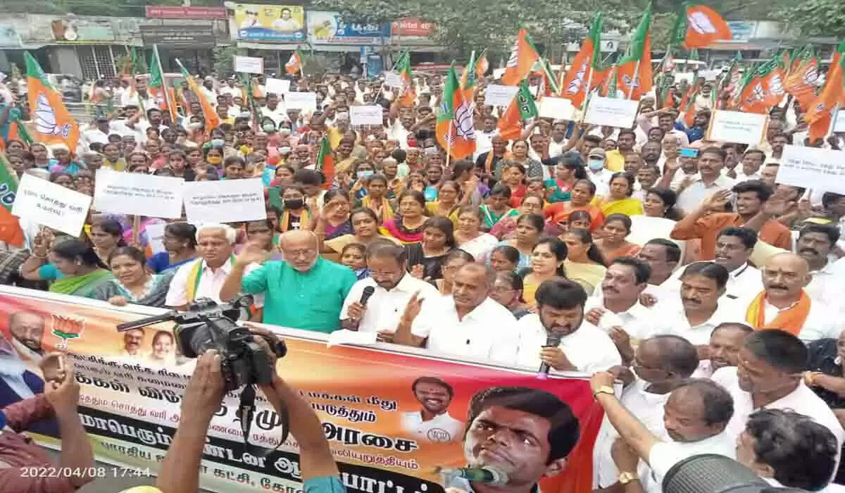 தமிழக அரசின் சொத்து வரி உயர்வை கண்டித்து தமிழகம் முழுவதும் பாஜக சார்பில் இன்று கண்டன ஆர்ப்பாட்டங்கள் நடைபெற்றன. கோவை மாவட்டத்தில் காந்தி பார்க் பகுதியில் பாஜக சார்பில் கண்டன ஆர்ப்பாட்டம் நடைபெற்றது . இந்த ஆர்ப்பாட்டத்திற்கு முன்னாள் எம்பி சிபி ராதாகிருஷ்ணன் தலைமை தாங்கினார். திமுக அரசுக்கு எதிராக பதாகைகளை ஏந்தி பாஜக தொண்டர்கள் இந்த ஆர்ப்பாட்டத்தில் பங்கேற்று முழக்கங்களை எழுப்பினர்.
