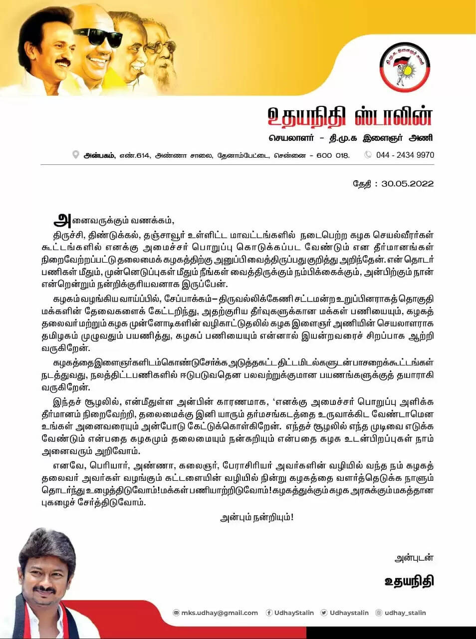 கழகத்தை இளைஞர்களிடம் கொண்டு சேர்க்க அடுத்தகட்ட திட்டமிடலுடன் பாசறை கூட்டங்கள் நடத்துவது நலத் திட்டப் பணிகளில் ஈடுபடுவது என பல பலவற்றுக்கும் ஆன பயணங்களுக்கு தயாராகி வருகிறேன். இந்த சூழலில் என் மீதுள்ள அன்பின் காரணமாக எனக்கு அமைச்சர் பொறுப்பு அளிக்க தீர்மானம் நிறைவேற்றி தலைமைக்கு இனி யாரும் தர்ம சங்கடத்தை உருவாக்கி விட வேண்டாம் என உங்கள் அனைவரையும் அன்போடு கேட்டுக்கொள்கிறேன். எந்த சூழலில் எந்த முடிவை எடுக்க வேண்டும் என்பதை கழகமும், தலைமையும் நன்கு அறியும் என்பதை கழக உடன்பிறப்புகள் நாம் அனைவரும் அறிவோம். எனவே பெரியார், அண்ணா, கலைஞர், பேராசிரியர் அவர்களின் வழியில் வந்த நம் கழக தலைவர் அவர்கள் வழங்கும் கட்டளையின் வழியில் நின்று கழகத்தை வளர்த்தெடுக்க நாளும் தொடர்ந்து உழைத்திடுவோம்! மக்கள் பணியாற்றுவோம்! கழகத்துக்கும் கழக அரசுக்கும் மகத்தான புகழை சேர்த்திடுவோம்” எனக் குறிப்பிட்டுள்ளார்.