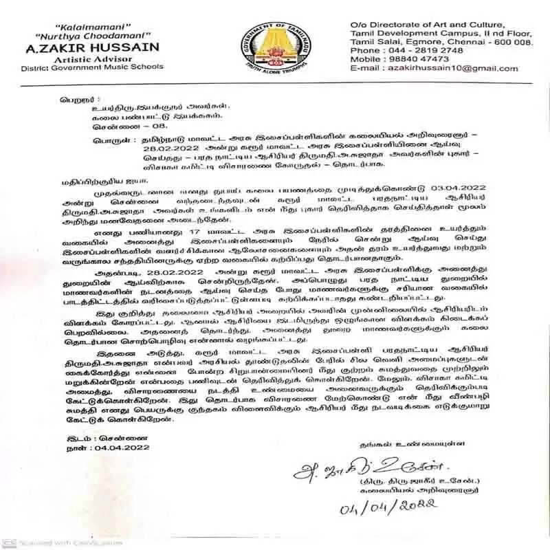 ’’முதல்வருடனான எனது துபாய் கலை பயணத்தை முடித்துக் கொண்டு3.4. 2022 அன்று சென்னை வந்தடைந்தவுடன் கரூர் மாவட்ட பரதநாட்டிய ஆசிரியர் சுஜாதா உங்களிடம் என் மீது புகார் தெரிவித்ததாக செய்தித்தாள் மூலம் அறிந்து மன வேதனை அடைந்தேன். எனது பணியானது 17 மாவட்ட அரசு இசைப்பள்ளிகளின் தரத்தை உயர்த்தும் வகையில் அனைத்து இசை பள்ளிகளையும் நேரில் சென்று ஆய்வு செய்து இசைப் பள்ளிகளில் வளர்ச்சிக்கான ஆலோசனைகளையும் அதன் தரம் உயர்த்துவது மற்றும் வருங்கால சந்ததியினருக்கு ஏற்ற வகையில் கற்பிப்பது தொடர்பானதாகும் .