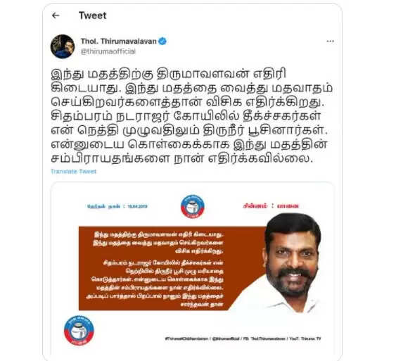 இந்து மதத்திற்கு திருமாவளவன் எதிரி கிடையாது. இந்து மதத்தை வைத்து மதவாதம் செய்கிறவர்களைத் தான் விசிக எதிர்க்கிறது. சிதம்பரம் நடராஜர் கோயிலில் தீட்சிதர்கள் என் நெத்தி முழுவதிலும் திருநீறு பூசினார்கள். என்னுடைய கொள்கைக்காக இந்து மதத்தின் சம்பிரதாயங்களை நான் எதிர்க்கவில்லை. அப்படிப் பார்த்தால் பிறப்பால் நானும் இந்து மதத்தைச் சார்ந்தவன் தான் என்று சொன்ன விடுதலை சிறுத்தைகள் கட்சியின் தலைவர் திருமாவளவன் இன்று, பட்டியலின, பழங்குடி மக்கள் இந்துக்கள் இல்லை என்பதை பிரகடனப்படுத்த வேண்டும். அல்லது அவர்களை பூர்வ பவுத்தர்கள் என அறிவிக்க அரசியலமைப்பு சட்டத்தில் திருத்தம் கொண்டு வர வேண்டும் என்று நடாளுமன்றத்தில் கோரிக்கை விடுத்திருக்கிறார்.